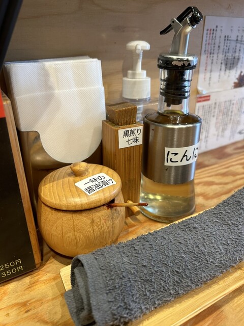 テーブル調味料(にんにく酢、黒煎り七味、一味の醤油漬け)を少しずつ足しては