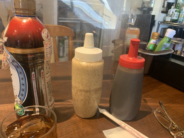 卓上の調味料類は醤油、ソース、胡麻ドレッシング、ワサビ、七味唐辛子などで、一般的なものですね。