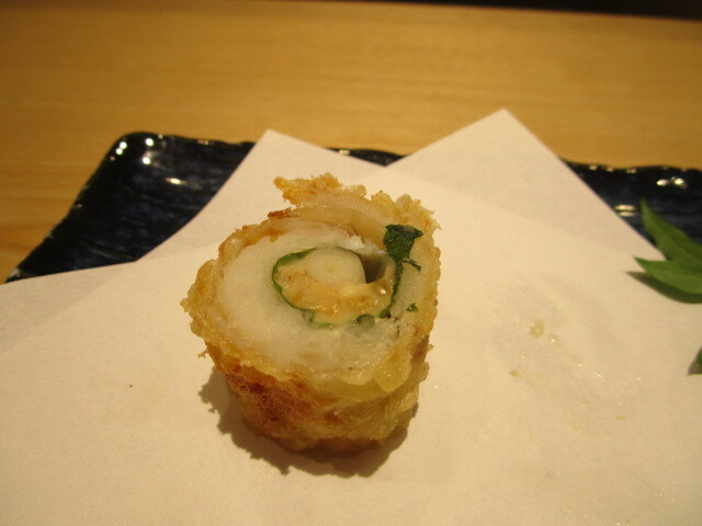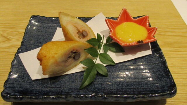 揚物 エビと零余子(むかご)と榎木のハトシ