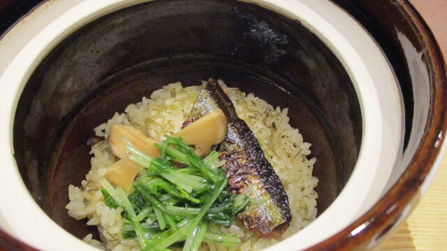食事 太刀魚の幽庵焼きと松茸の土鍋ご飯 赤出汁 香の物