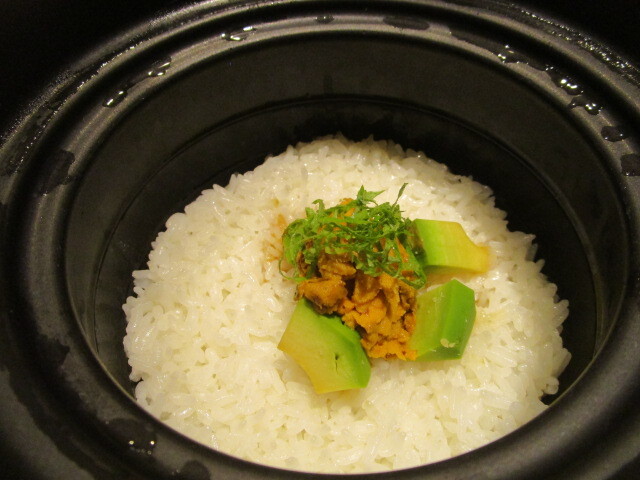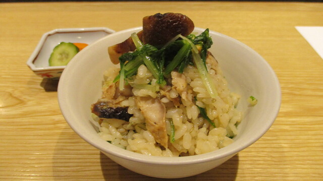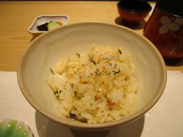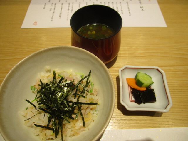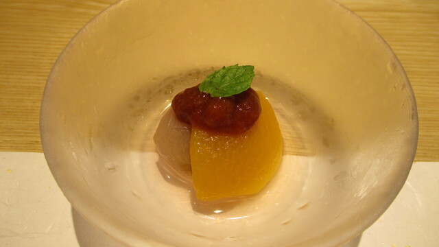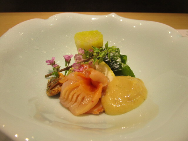 先付の冷製茶碗蒸しは、気温が上がったこの時期にひんやりとしてうれしい。対馬産穴子の煮凝りもとろりとおいしかった。八寸には稚鮎が登場。鯵の酢〆と行者大蒜のぬた和え。鯵の〆具合いいですね。そら豆と蛸の黄身揚げは食感が面白く味わい深かった。早生胡瓜の諸味チーズ和え・・この諸味チーズがおいしくて、これはワインにも合いそうだと思いました。いつもながら宝箱のような八寸。椀物は甘えびのすり流し。5月の緑の季節にぴったりの色合いで、品の良いすり流しが枝豆湯葉と焼き豆腐にあっています。焼き物は黒毛和牛にルッコラのソース。このソースもおいしい。蓋を開けるのが楽しみな炊物は合鴨信田巻き。口に含むとジワリとうまみが広がるところが好きです。海松貝の松前ご飯は紫蘇がアクセントになって、これも大変おいしくいただきました。お御馳走様でした。