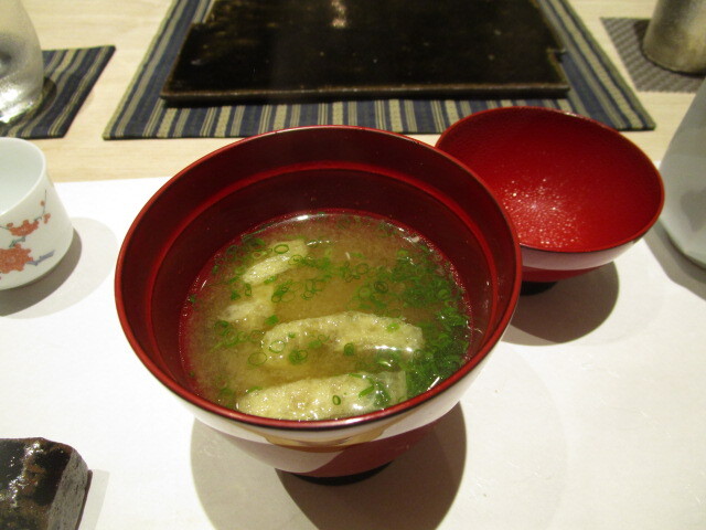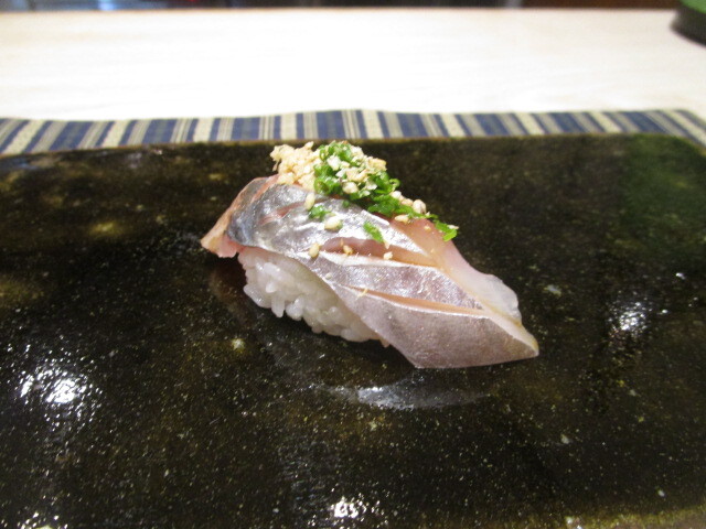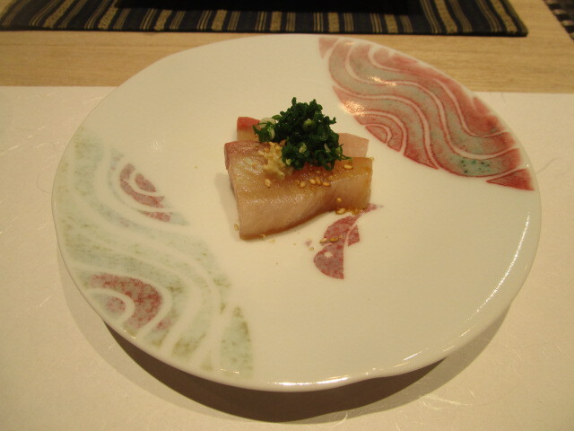 久しぶりに伺いました。最初は暑かったので珍しく一番搾り。茄子の揚げびたしがおいしく期待もさらに膨らみます。お造りは熟成されたタイ。ほんのり柑橘の香りが乗り、夏の鯛だというのに驚くほどおいしかった。おばいけと若芽、ヒラマサのおつくり、トウガンと豚肉の餡かけ。これには能古見を合わせました。チーズ入り茶碗蒸し、これも久々にいただきましたが、とてもおいしかった。自家製のからすみも香ばしい。次のお酒は佐賀の七田のぬる燗。にぎりもすべておいしくいただきましたが、中でも今回印象に残ったのが、鯛のシンコ。コハダのシンコもおいしかったけれど、これは口どけ、脂の乗りとも絶妙でした。今度は秋に伺いたいです。