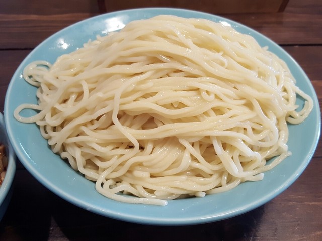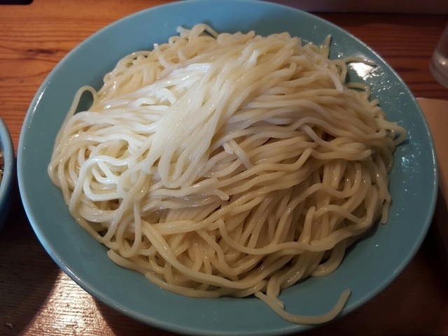 ここのつけ汁は、千切りのチャーシュー・メンマ・ナルト、そしてネギが入るのが基本(基本具)ですが、今回はこれにメンマが入っています。そして、相変わらずつやっとした綺麗な麺です。ここのお店の麺は、とても美味しいと思います。普通盛りが260gですが、大盛り(1.5倍)にしたので、約390gあります。