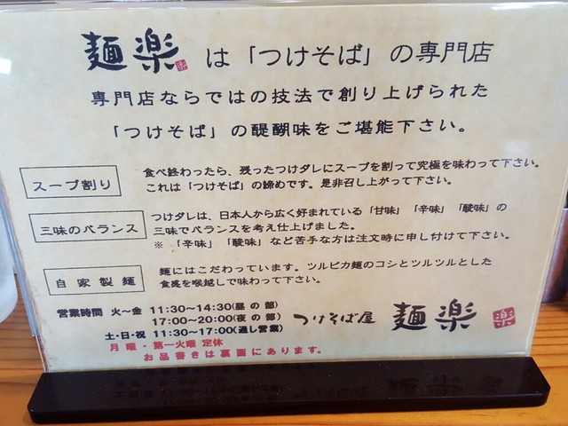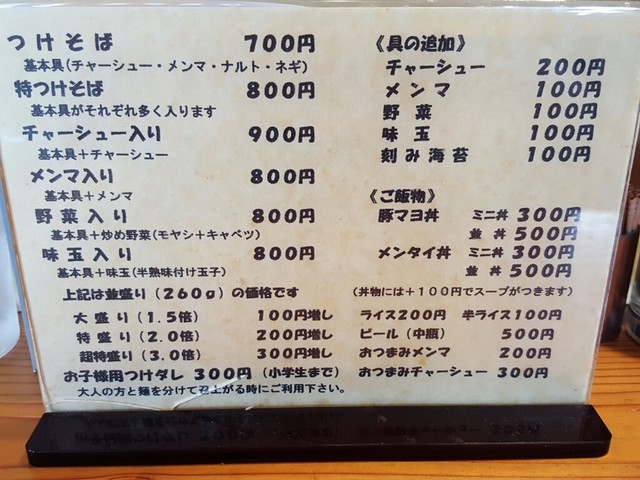 青梅市野上町のつけ麺(店ではつけそばとしている)専門店である。メニューは(サイドメニュー以外では)つけ麺のみ!トッピングと麺の量で値段が変わる。