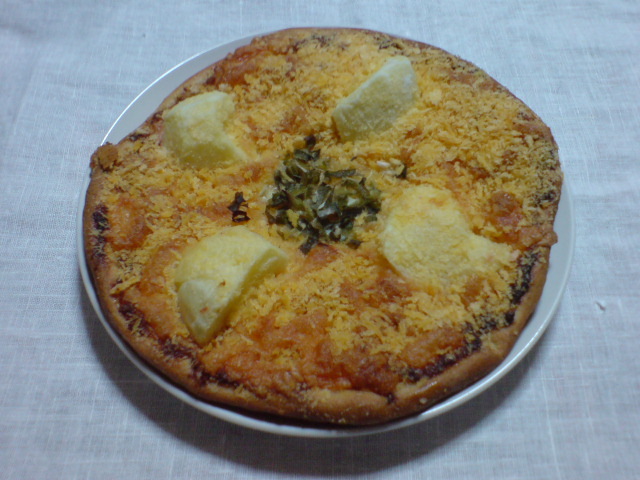 平焼きの明太子とポテト…上に乗った明太子は辛味も塩気も強過ぎる事無く、ジャガイモとの相性が良く、クリスピーな生地が良い食感で楽しい。
