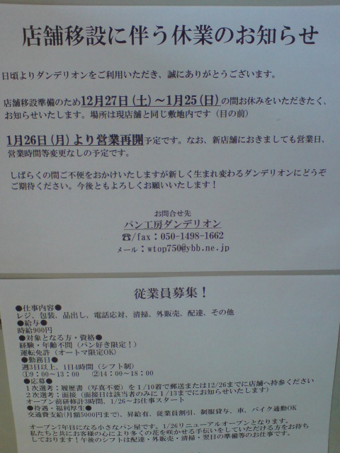 2014年12月27日(土)~2015年1月25日(日)まで、少し長い休業だそうです。