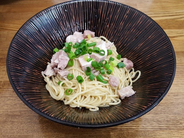 タレが入っているとの事なので、「説明書」にあるように、まず混ぜてみる。ちょっと混ぜにくい。麺の周りが乳化(?)しているからだろうか?