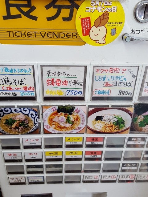 まず券売機で食券を買うスタイルである。今回は、昔ながらの生姜中華(中細麺、醤油)\750にしてみた。