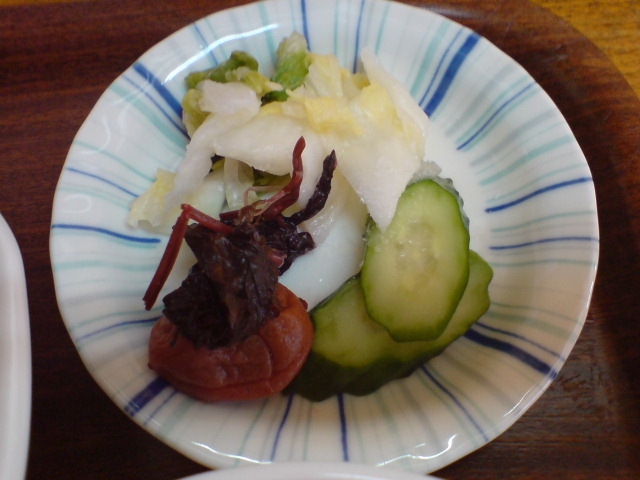 漬物は胡瓜・白菜・梅干(赤紫蘇漬)。胡瓜・梅干は丁度良い塩梅でした。白菜はちょっと塩辛かったですが、味自体は悪くないです。