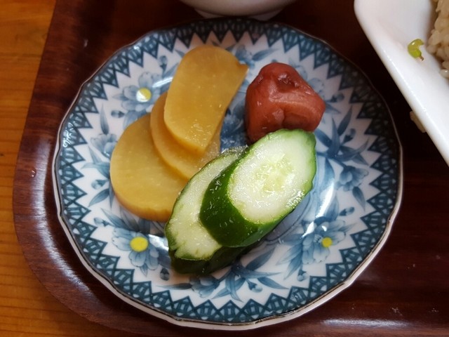 漬物のキュウリ・タクワン・梅干し。上に味の素がかかっているのは、何となく昭和の風情(?)を感じさせる。味の素自体は嫌ではないが、漬物自体がちゃんと美味しいので、これはむしろなくて良いと(私は)思う。