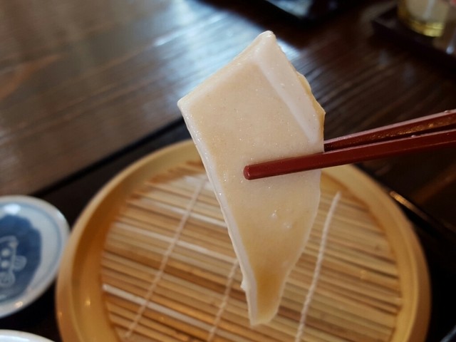 うどんは白くなく、グレーがかった色である。確か、国産小麦粉100%となっていた様に思う。しっかりとした太さがあり、端にひもかわとでも言うのだろうか?平たい切れ端の様な部分も乗っている。