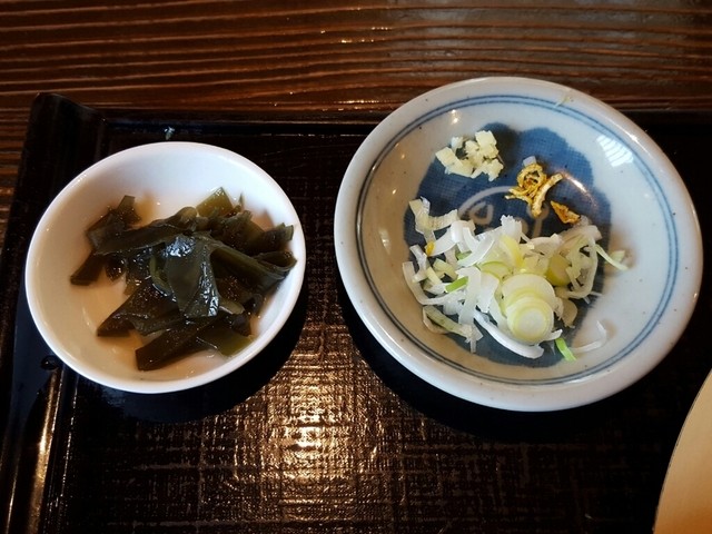 つけ汁の中には、厚めの豚バラ・油揚げ・ナスの素揚げ(?)・シイタケ・ネギが入っていた。小皿にはコンブ(もしかしたら厚葉のワカメかも?)を甘めに煮たモノ、薬味の小皿にはネギ・ショウガ・ユズの皮が乗っている。