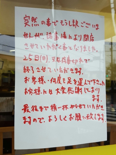 ※店前の貼り紙に、9月25日(日)の営業をもって閉店する旨が書かれていた(お店のHPにも記載あり)。