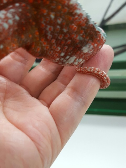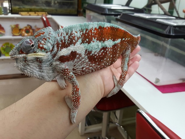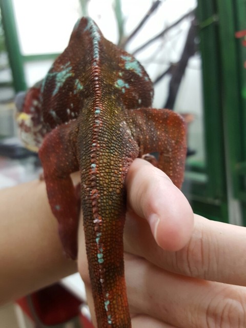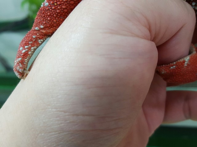 ヒガシくん♂は結構大き目!長く腕に乗せていると、その重さを感じる事が出来る。かなりハデメのカラーだ。