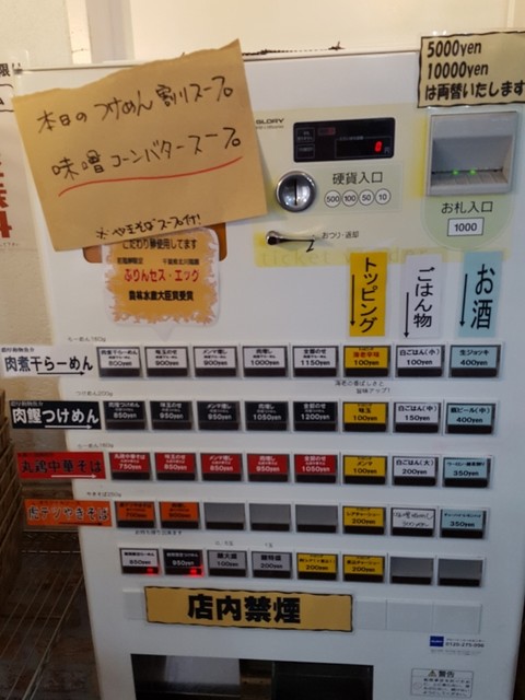 の食券を購入し、店員さんに渡す。ランチタイムサービスの麺大盛りも同時にお願いする。