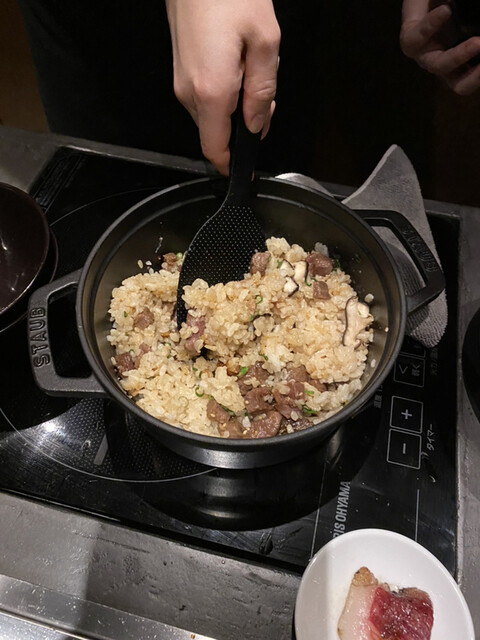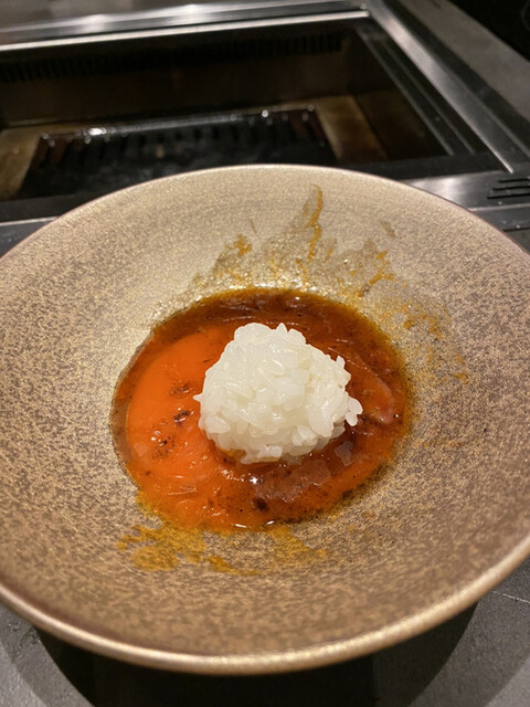 とびえい和牛のサーロインをサッと炙って卵黄と一口ご飯の上にオン