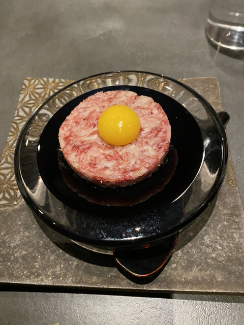 肩三角を使ったユッケは太田ファームの黄身と絡めて噛み締める