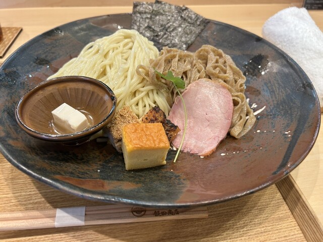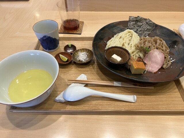 つけ麺は塩、2種付の麺に3種類のお肉、海苔、卵焼き、胡麻豆腐が付け合わせでいただけます。