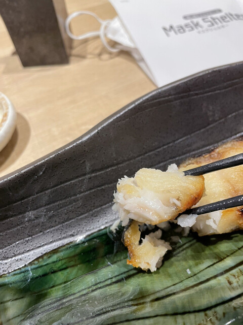 縦に箸でかきながら食べる、魚を初めてこんな食べ方するね。味がふわふわで味噌と合う、絶対日本酒と合う、飲めないが。