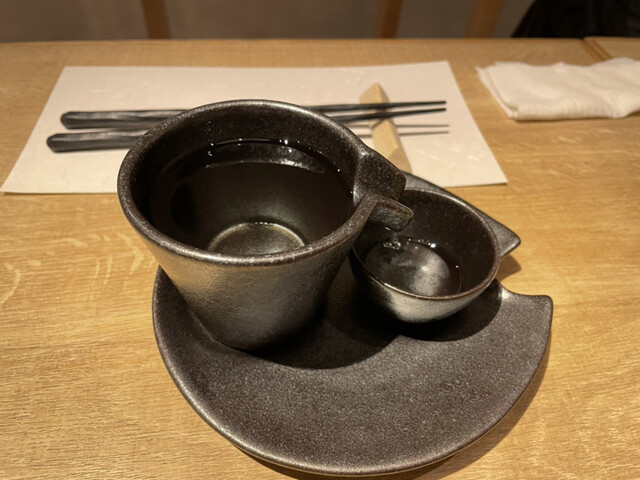 先客2組、入ると店員さんがドアを開けてくれて予約を確認してくれます。落ち着いた店内です。丸みを帯びた木が柔らかな雰囲気をかもしだしてます。落ち着いた客層です。