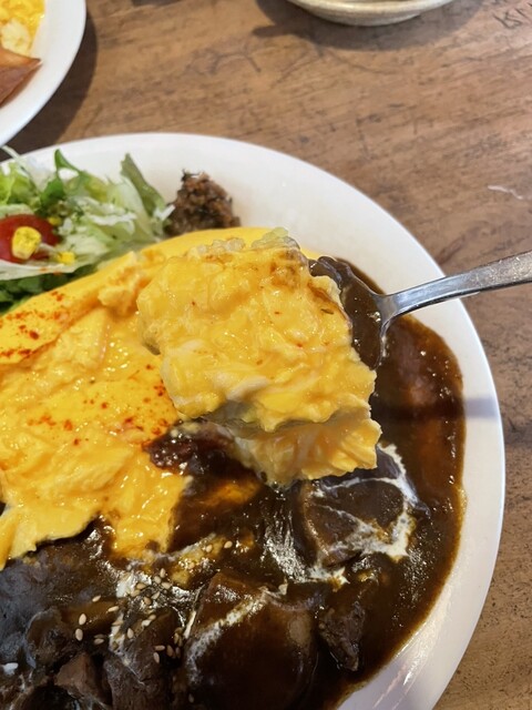 妻はオム➕ソーセージカレーとホットコーヒー、私はオム➕牛タンカレーを注文です。
