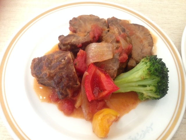 本日の肉料理に初チャレンジ。豚肉のトマト煮込みなんとか(笑)ってゆう毎週月曜日のメニューです。