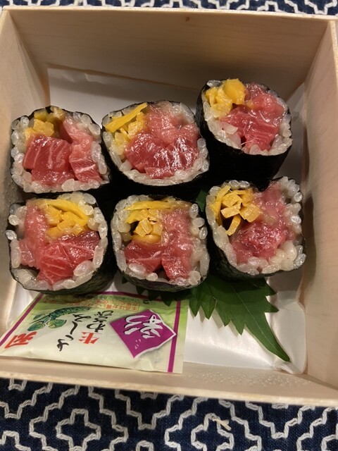 見る限り、どれも一見して綺麗で上等な魚介類達が並び少し冷静さを欠き、初訪問ということもあり的が絞りにくく迷っていると、店主さんからマグロのはがし(マグロの背中の部位の筋を取り除いたもの)を薦められ、それ2つと、小振りな箱に入り目についたトロたく巻も2つ追加購入してみました。