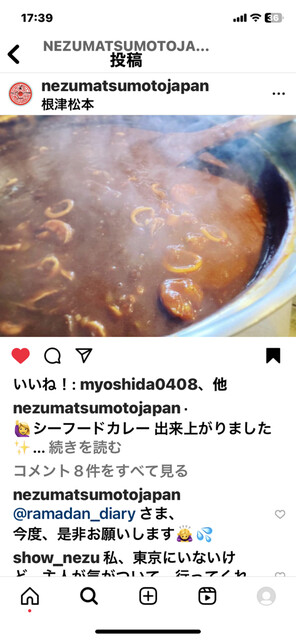 ・インスタに、カレー始めましたとの記載が過去ログにあり、これも聴いたところ、月一くらいでカレーやってます。これは、トコブシか何かの貝類を捌いた折に出てくる具材を使ってトマトと共に調理、美味しくできてます。ただし月一くらいで、インスタ記載の折に電話いただければ取っておきます。