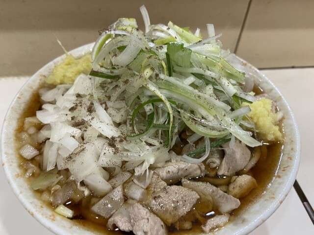 麺は太麺、麺の量は普通。トッピング 玉ねぎ。