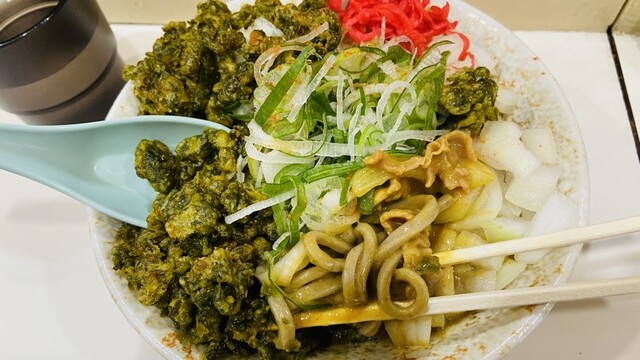 汁なしカレーそば+緑のたぬき+玉ねぎトッピング+ベニー+カイエンペッパーを掘り下げて