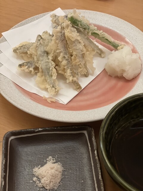 今日は季節のメニューからわかさぎの天ぷらと鯛の昆布締の刺身と締め鯖、板わさ、ムカゴと銀杏の素揚げ、定番の身欠ニシン、そして締めの蕎麦はぶっかけ蕎麦、穴子天丼と辛味おろし蕎麦を!