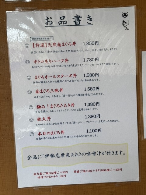 前回と全く同じカウンター奥の席に通されました。メニューから今回は「まぐろオールスターズ丼」¥1,680を酢飯50g増し+¥100で注文。伊勢志摩産あおさの味噌汁が付きます。