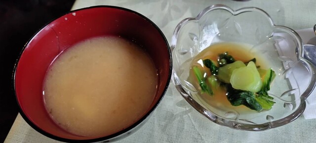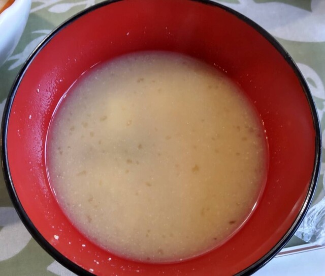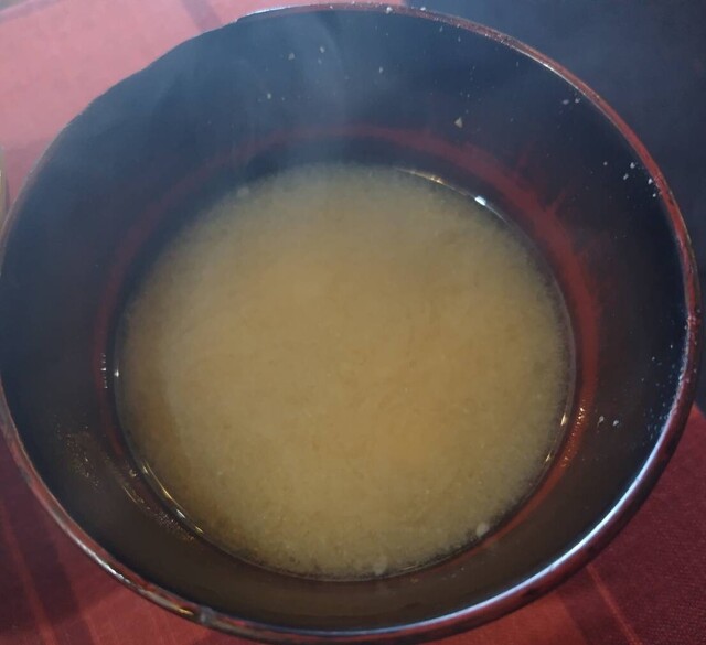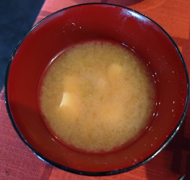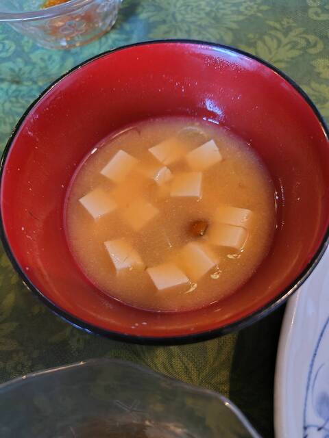 味噌汁はいつもの豆腐となめことねぎ。群馬にしては薄味で塩味を感じません。