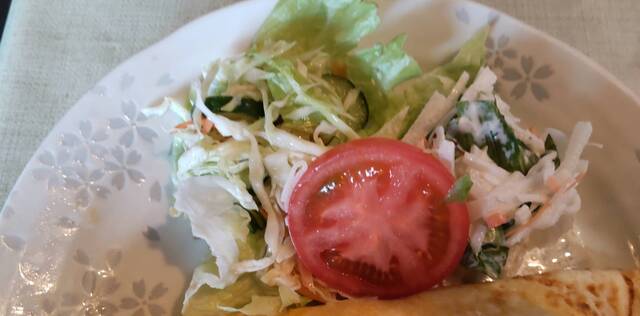 サラダはひと手間かけていて、野菜を食べやすくしんなりさせるため薄い塩水で揉んでからよく搾ってマヨネーズで和えています。そのため薄いマヨネーズ風味の中にほんのり塩味を感じます。