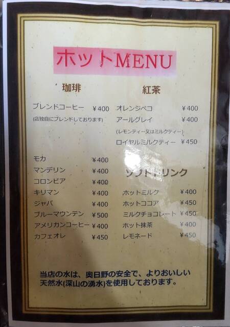 いつ飲んでも落ち着く味。名水を使っていますから美味しくないわけがない。このコーヒーの味はこの水だから出せる味なんだと、水にこだわるマスターの自信を味わいましょう!実に落ち着く美味しさ!