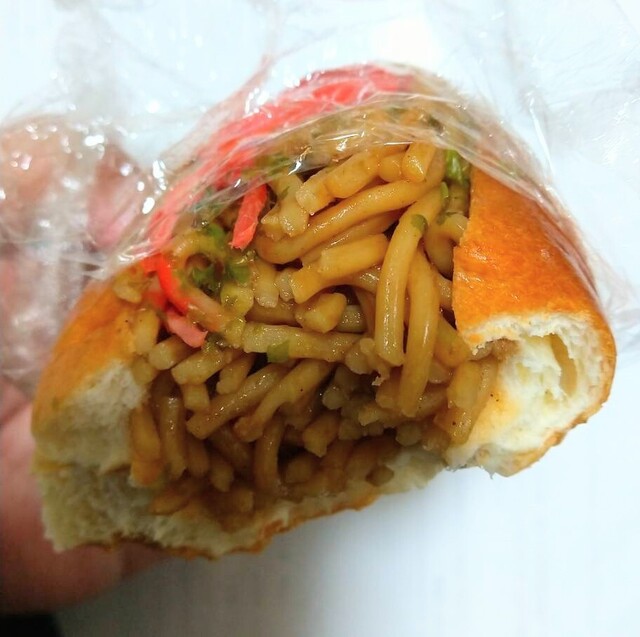 小さめのコッペパンに焼そばがこれでもか!と入っています。ひき肉こそわからなかったけど、もやしや青のり、紅しょうがは定番通りです。