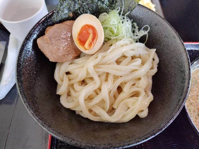 うどんを少量、つけ汁に入れて汁を絡めていただきました。そしてひとくち熱いうちに汁も口に含みました。