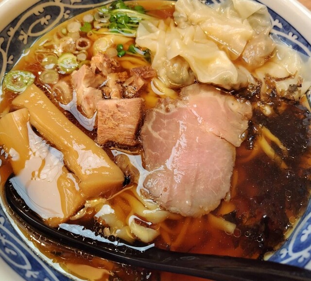 麺は細麺、具は豚チャーシュー、サイコロ状の鮪チャーシュー、メンマ、岩のり、刻みねぎ。