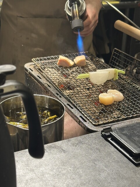 前回と同じように網でホタテとカブをあぶり、鶏をバーナーで処理