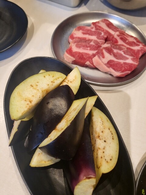 最初にお肉や野菜の盛り合わせとおにぎり(しゃり)が運ばれてきます。お肉も野菜も、これでもか!て感じの山盛りで、テンションがあがります。