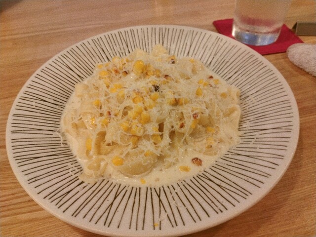 嬬恋村産の焼きとうもろこしと3種のチーズパスタ。