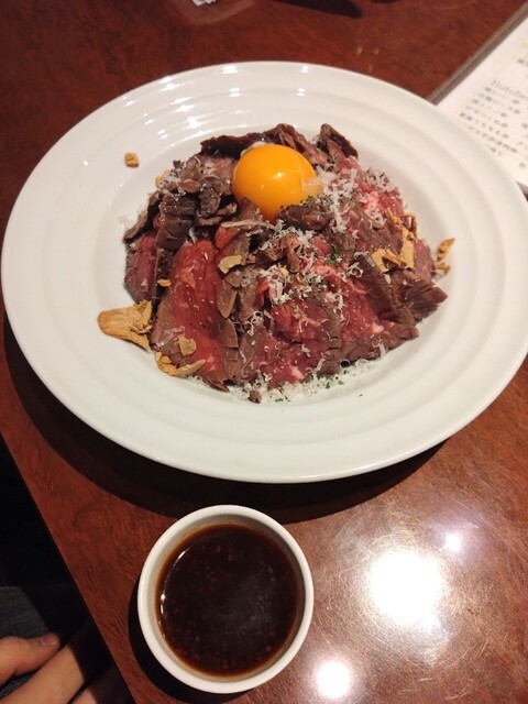 レバーのユッケ仕立ては低温調理していますが生に近い感じで、クリーミーというかまったりしてレバーのクセもなく美味しいです。ローストビーフ丼?は食べていないので何ともですが、柔らかくてソースも美味しかったそうです。