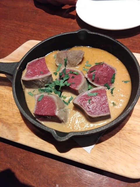 今回は違うものを注文して、娘と2人でちょい呑みしました。スキレットで出てきたのは和牛ハツのたたき香草オイルがけです。