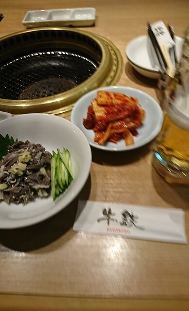夫婦2人でこの日はお邪魔しましたが、今回は残念な事に特タン塩が売り切れて無かったので、普通のタン塩を頼みました。美味しかったのですが厚みが特タン塩に比べると半分以下で薄いです。白菜キムチとサラダを巻いて食べるのには丁度良い薄さかもです。