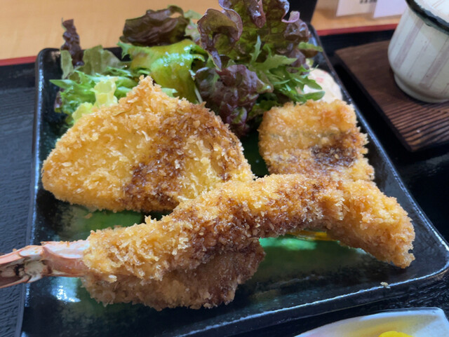 今日の日替わりランチ(税込900円)はミックスフライ定食です。これをお願いします。海老に白身魚のフライ、玉ねぎ、牡蠣。小鉢は菜花のお浸しです。こんなところにも春ですね。茶碗蒸しも付いてこの価格。コスパも良いですね。