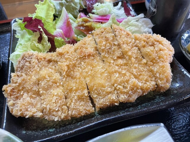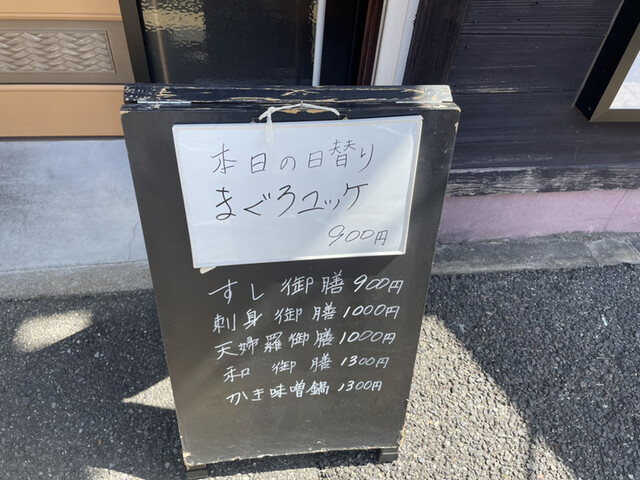 お店の外看板で「本日の日替わり 鮪のヅケ丼」を見て入りました。待つ事しばし、料理が登場。分厚い鮪の切り身がご飯が見えないほどどーんと乗ってます。小鉢とお味噌汁が付いて900円とは今時嬉しいお値段。