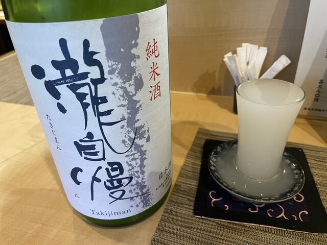 カウンター席に座ってメニューを拝見。先ずは鯵刺身(税込580円)と三重の瀧自慢・純米酒(グラス・780円)をお願いします。お通し(税込550円)は牛しぐれ煮、蕨など。瀧自慢は濁り酒、舌先にピリッと来る感覚のお酒です。