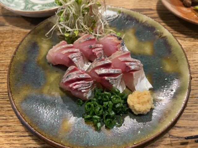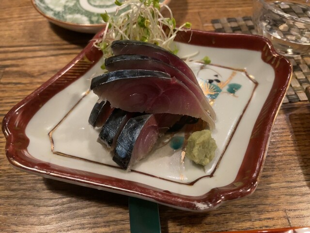 吾有事は濁り酒でピリっとした口当たりのお酒です。刺身盛りは松川かれい、鰤、カマス焼霜作りに〆鯖でした。〆鯖はもうちょい〆た方が好きだけど、どのお魚も美味しい。