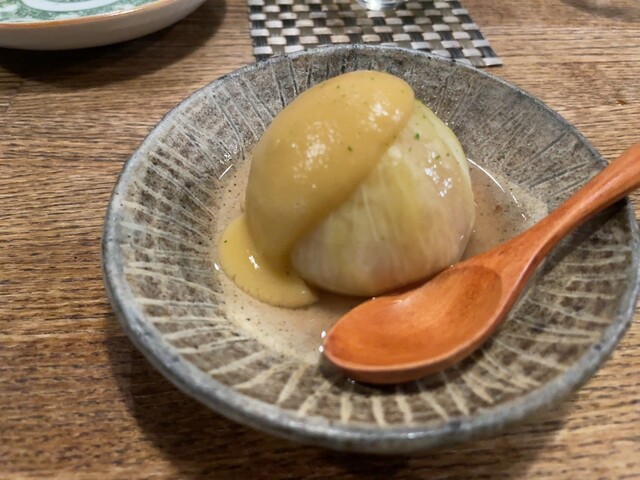 二回戦は初めてのお酒、甲子アップルをお願いします。こちらは名前の通り林檎を感じさせるフルーティなお酒。日本酒と言うよりは白ワインって感じです。イチヂクの風呂吹き(税込440円)と言うのが気になり大将に聞いてみると、イチヂクを丁寧に蒸して、オリジナルの味噌タレをかけたものだそうです。これをお願いしました。甘くて美味しい。イチヂクにこんな食べ方があるとは!
