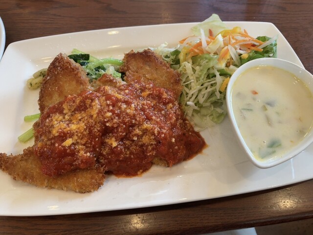 今日は三重豚のカツレツにしました。待つ事しばし、料理が登場。プレートの上にはオリジナルのトマトソースがたっぷりとかかったカツレツ。サラダに具沢山のスープもあります。